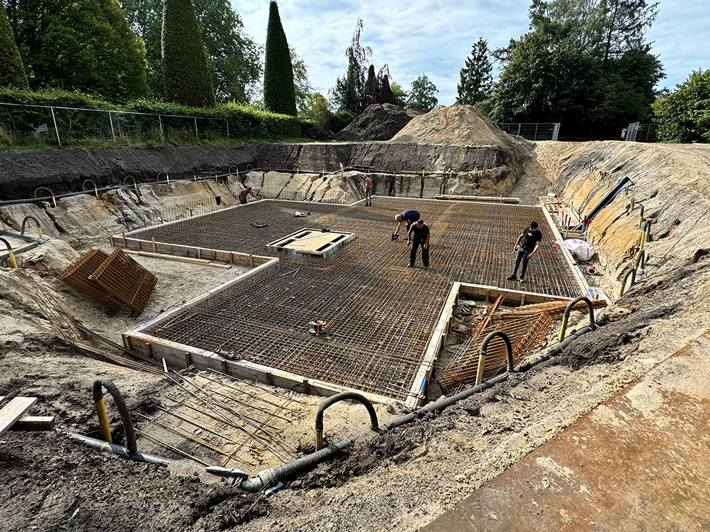 De bouw van GUV Uitvaartcentrum Winterswijk is gestart. We startten met bronbemaling en daarna is gestart met de voorbereidingen voor de vloer van de kelder. De keten van aannemer Hengeveld staan klaar. Er wordt is al hard gewerkt! De vloer is net in het begin van de bouwvakgestort zodat deze goed kan uitharden.